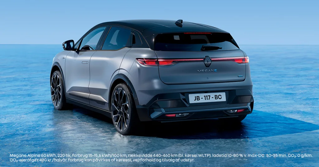 Privatleasing Renault Megane E-Tech esprit Alpine 60 kWh 220 hk, range 434-468 km. (maksimal rækkevidde ved blandet kørsel. Omfang af faktisk kørsel af påvirket af vejrforhold, kørestil, hastighed mm.): 14.995 kr. i førstegangsydelse, Mdl. ydelse fra 2.995 kr., min. pris i bindingsperioden (12 mdr.): 50.935 kr. inkl. 10.000 km/år. Leasingperioden (48 mdr.): 158.755 kr. inkl. 10.000 km/år. Afleveringsgebyr kr. 0. Mulighed for anden førstegangsydelse og/eller flere km i perioden, se venligst privatleasing beregner på renault.dk for priser og betingelser. Den viste bil har metallak/to-farvet og ekstraudstyr til merpris, forbrug 15,1-15,6 kWh/100 km. (bl. kørsel WLTP). Prisen gælder fra 04.02.2026 til 28.02.2026 (Ansøgning skal være indsendt og underskrevet af kunde og positiv kreditgodkendelse skal være gennemført i den nævnte periode). Bil skal være leveret og registreret senest 31.05.2026. Begrænset antal. Kræver positiv kreditvurdering, køb af kaskoforsikring, BS-betaling. Inkl. serviceaftale og standardlak, ekskl. dæk, strøm, forsikring, CO2-ejerafgift og overkørte km. Privatleasing via Renault Finans (Nordania Finans). Se vilkår mv. på privatleasing.renault.dk og prisen på den viste variant. Der tages forbehold for pris- og afgiftsændringer samt trykfejl og udsolgte modeller/varianter.